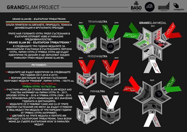 Новото предизвикателство на българските ултрамаратони! "Grand Slam BG - Български трибагреник" е нов проект, който може да донесе на любителите на природата, планините и бягането три медала, които в комбинация формират един сборен троен медал! Участието и спечелването на трите големи ултрамаратона в България - Трявна ултра, Персенк ултра и Пирин ултра е условието за спечелване на тройния медал! Нека тренировките започнат сега!