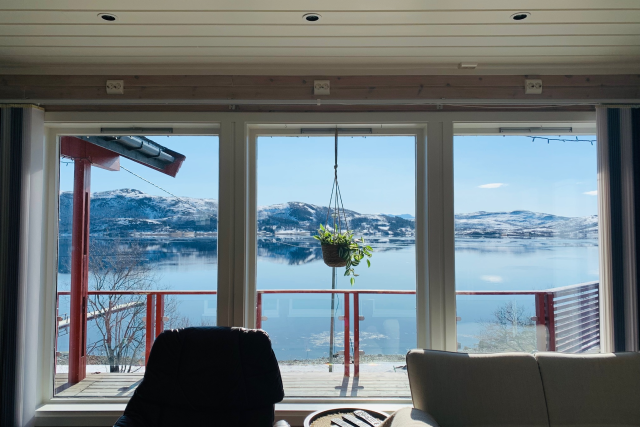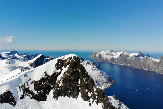 от високо към океана, околните планини и фиордите са наистина