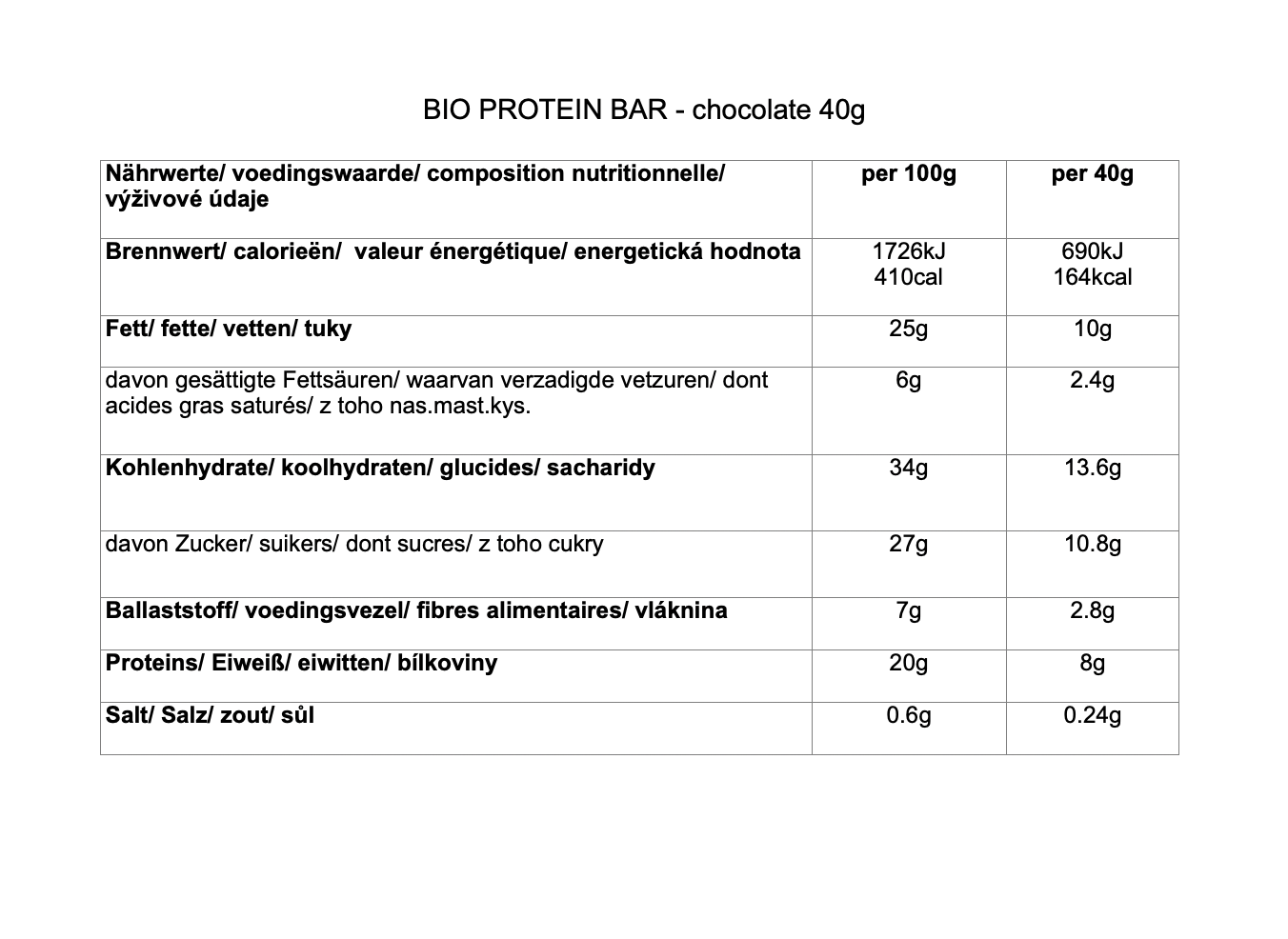 Състав: фурми*, бадеми*, оризов протеин* (15%),шоколад* 13% (какаова паста, какао на прах, какаово масло 6%, съдържание на какао 100%),сироп от агаве*, тиквени семки*, върджин зехтин*, сол*. (*Сертифициран органичен продукт).