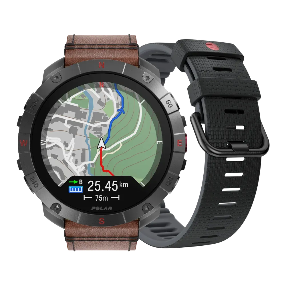 Equipped with extensive battery life and a comprehensive suite of training and recovery tools, and including 2 wristbands in leather and silicone, Polar Grit X2 Pro Titan is an essential piece of gear crafted for exploring the wonders of the world, and the body.