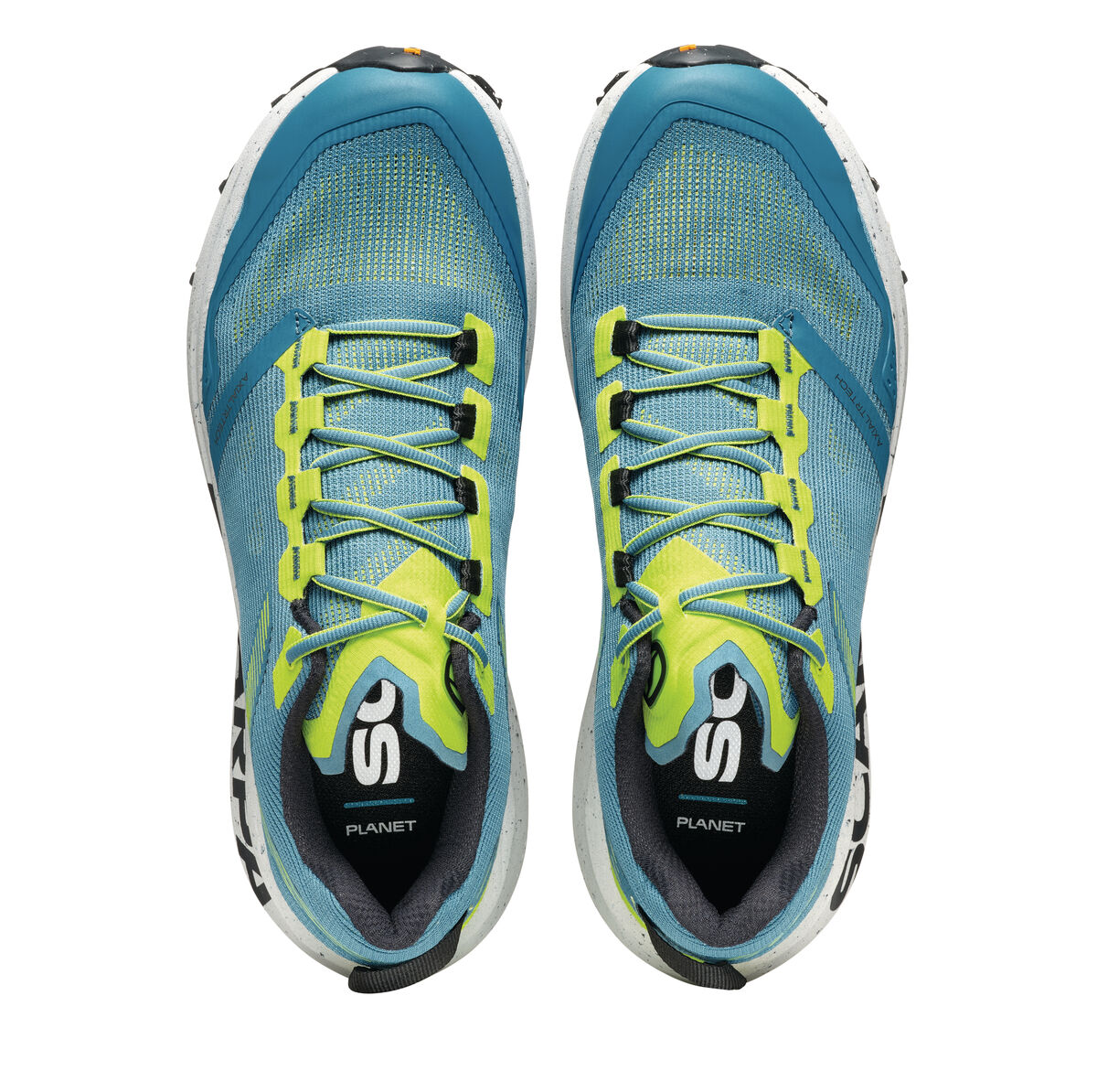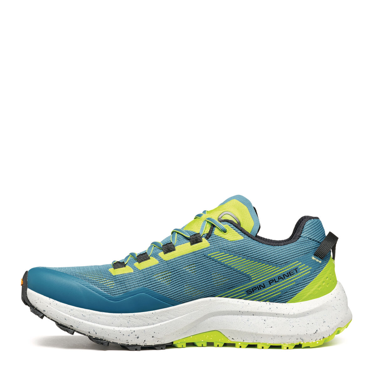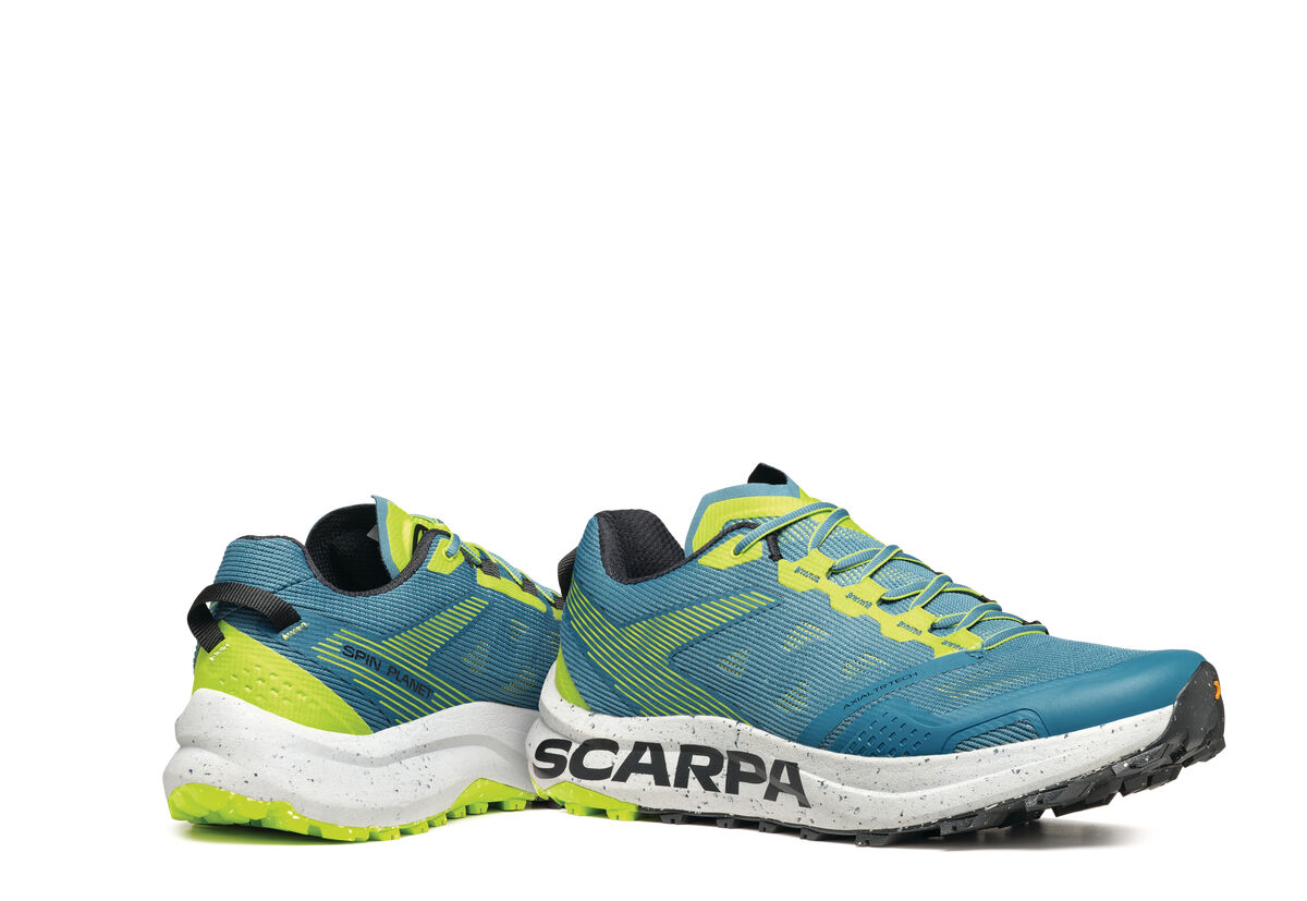 Следващата стъпка в пътуването на Scarpa за устойчиво развитие, SPIN PLANET въвежда нова концепция в категорията Trail Running с горната си част, която е изработена от 100% рециклирани материали, докато EVA междинната подметка е 45% рециклирана, а гумената външна подметка е 30% рециклирана. Идеалните обувки за бегачи, които преследват дълги разстояния по трейл пътеките, благодарение на обема на междинната подметка, предназначен да абсорбира ударите със земята и да осигури защитно омекотяване.