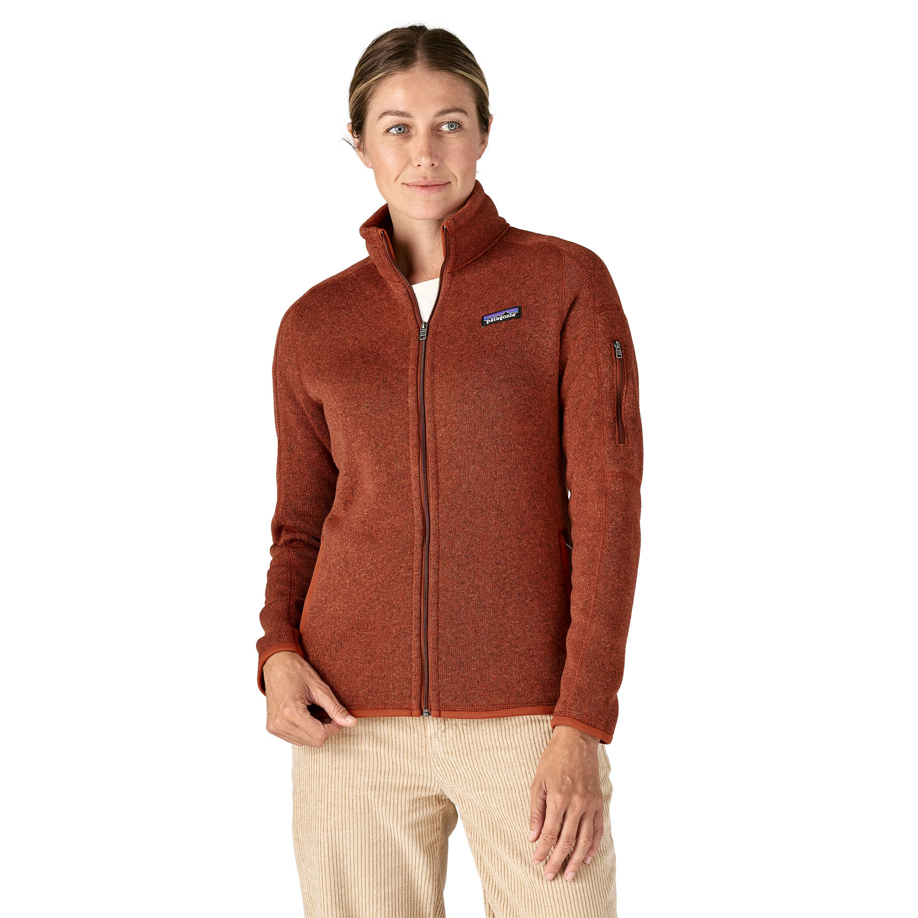 Това топло яке с цип от 100% рециклиран полиестер съчетава естетиката на плетен пуловер с лесната грижа на полара Better Sweater. То е боядисано с процес с ниско въздействие, който намалява употребата на багрила, енергия и вода в сравнение с конвенционалните методи за боядисване на пух. Произведена е във фабрика със сертификат за справедлива търговия Fair Trade Certified™.