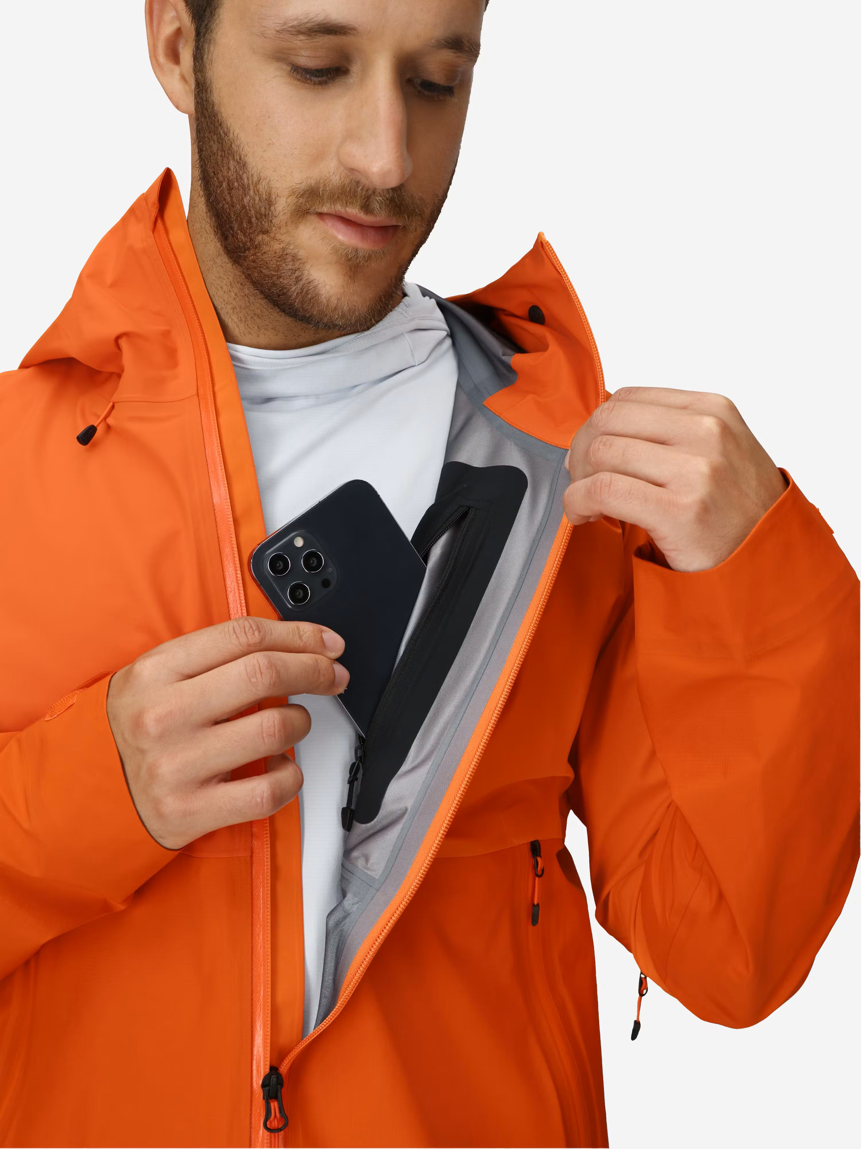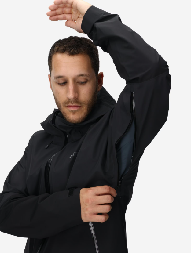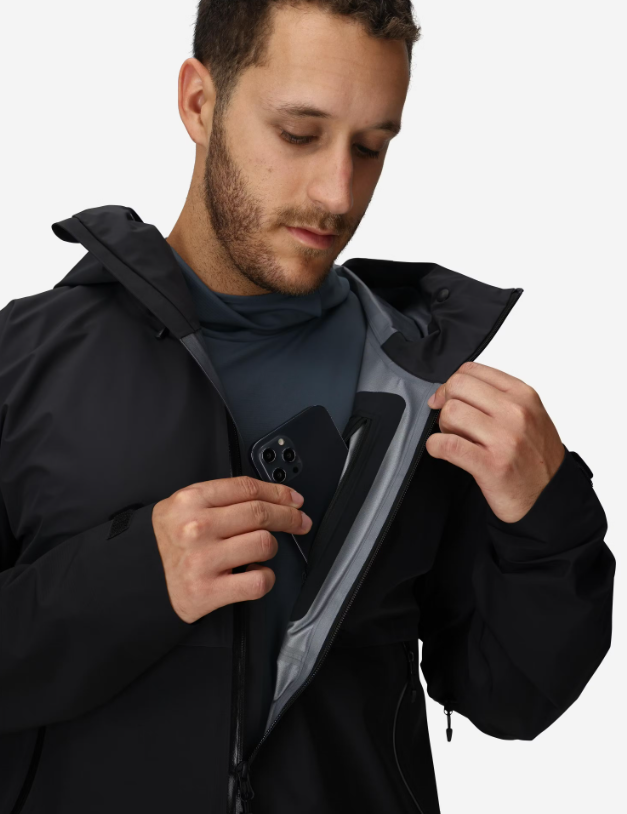 Якетo разполага с регулируема качулка, съвместима с каска, водоустойчиви ципове, вентилационни отвори под мишниците и джобове с цип, достъпни дори с раница или катерачен колан. Леката му конструкция позволява лесно прибиране в раница.